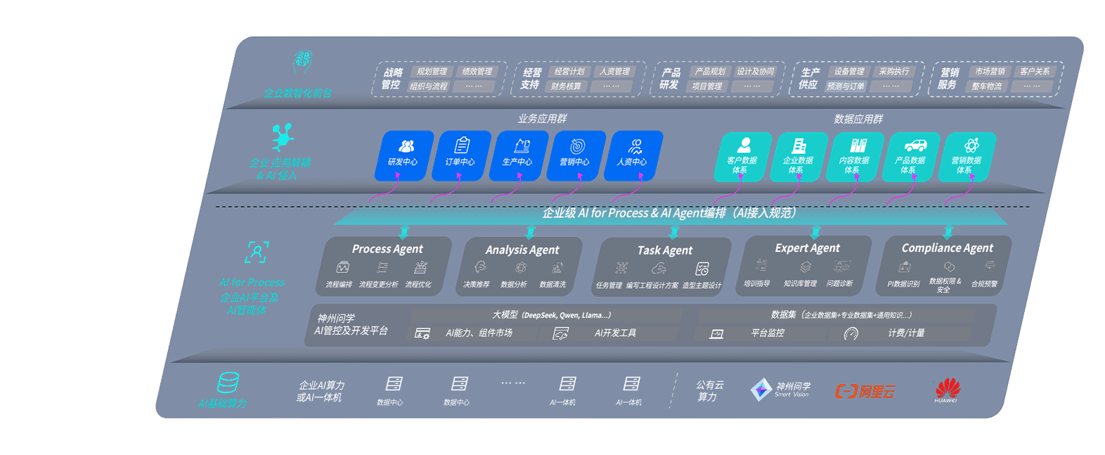 端到端的一站式AI工作空间深度融合了从企业战略规划到日常经营的全流程业务板块,,定向解决车企内部领域多、、、部门多、、链条长、、、场景碎片化等难题,,,支持车企快速构建以AI为核心的生产力写作体系,,,实现任务执行与AI能力的无缝集成与交互