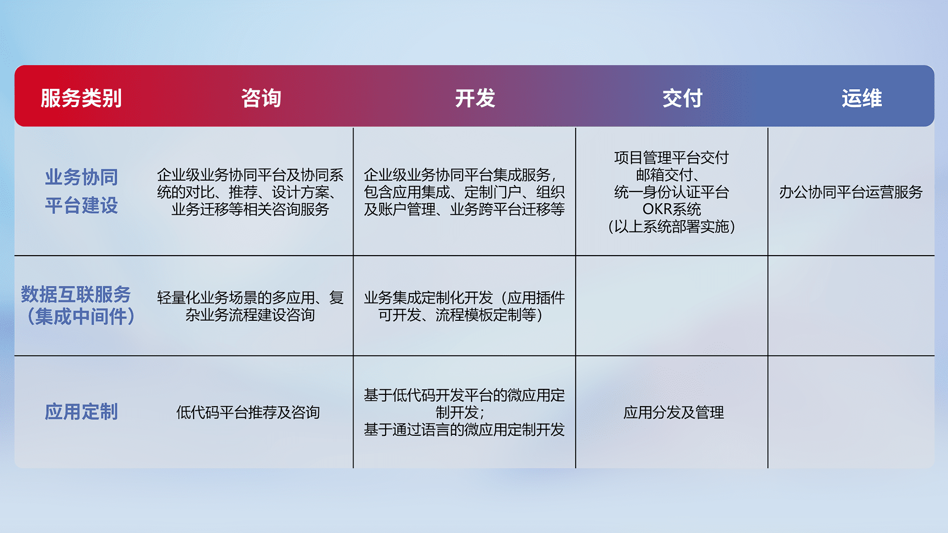 针对钉钉、、企微、、、、IDaas等平台级产品提供产品的规划、、方案、、、、交付、、、、定制化开发等服务,,实现如统一协同办公、、智能客户服务、、、混合会议管理、、、智能数据查询、、等业务场景,,,,实现数字化转型。。。